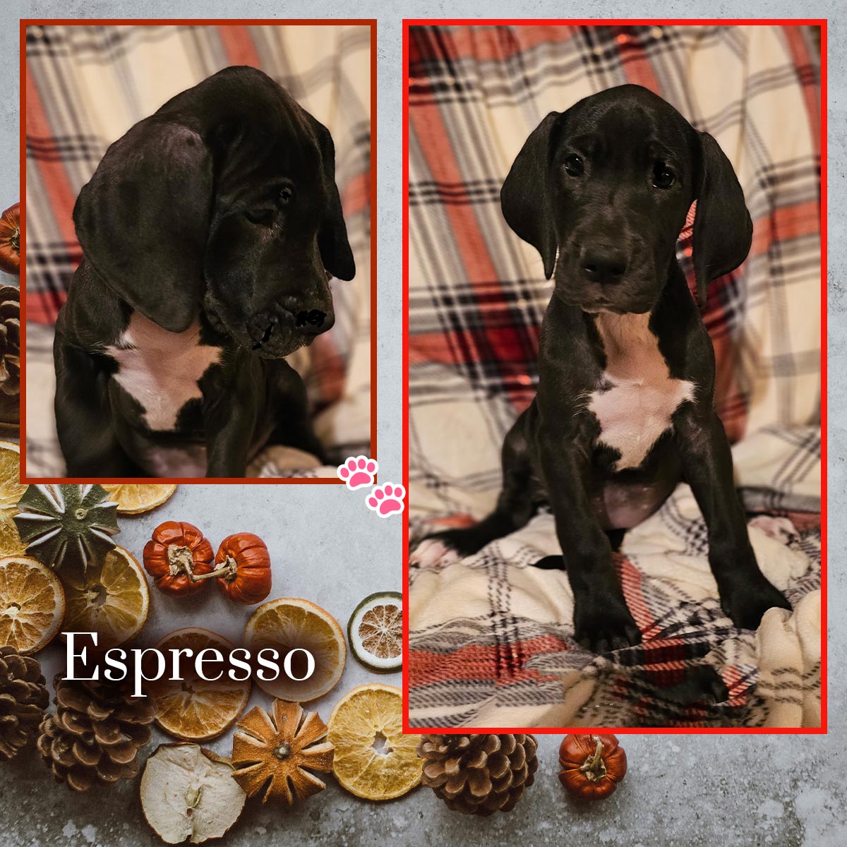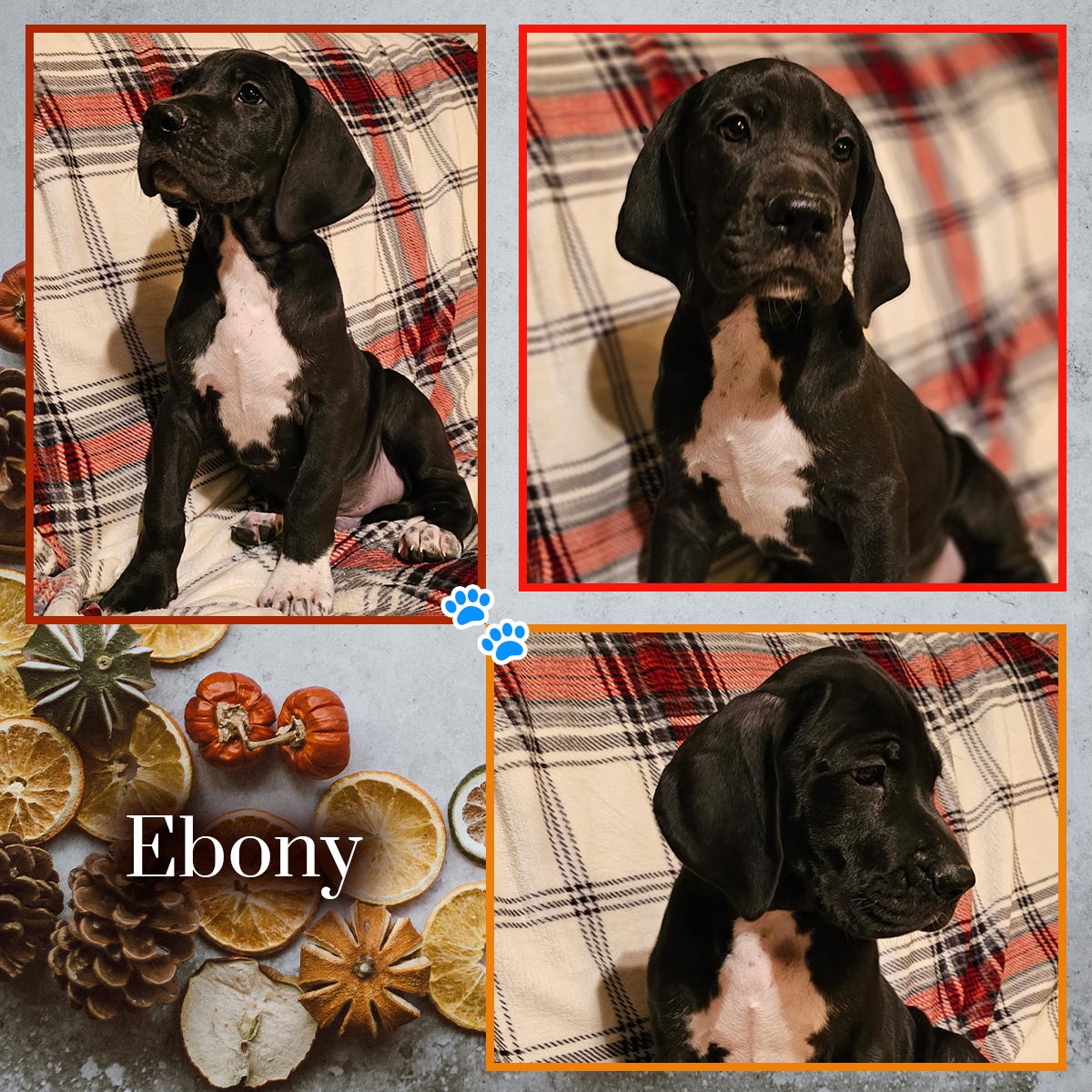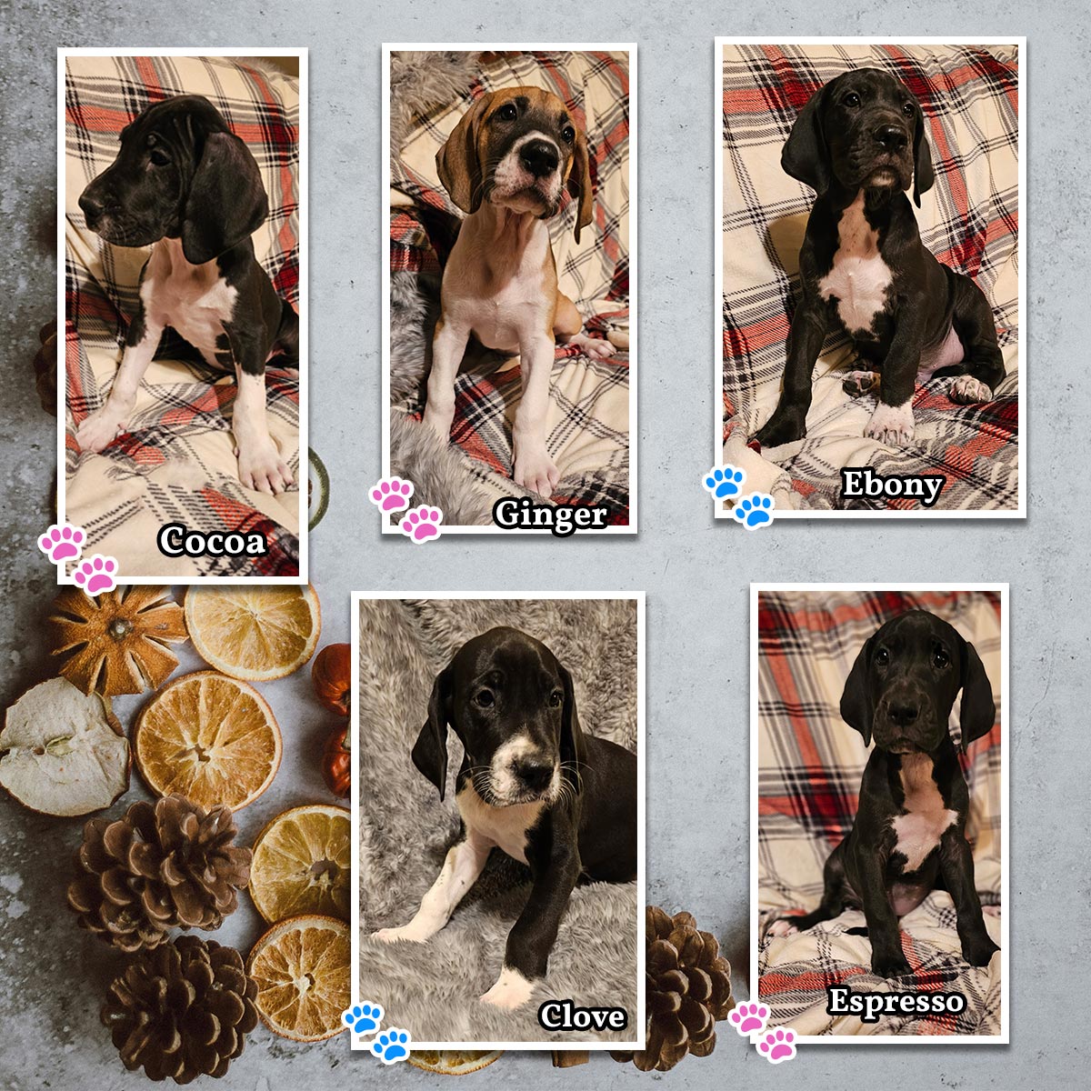 Introducing the Fall Flavors litter! Born 10/01/25. Sweet Evie is officially a mama — and she delighted us with 10 beautiful puppies! Everyone is healthy, wiggly, and already melting hearts here at Happy Danes Farm.