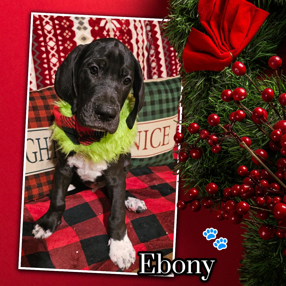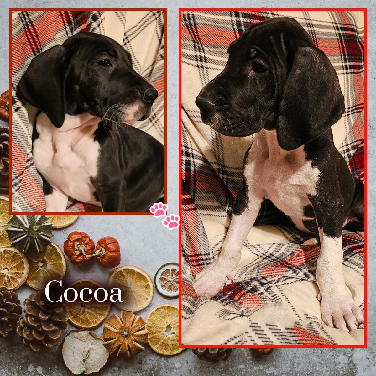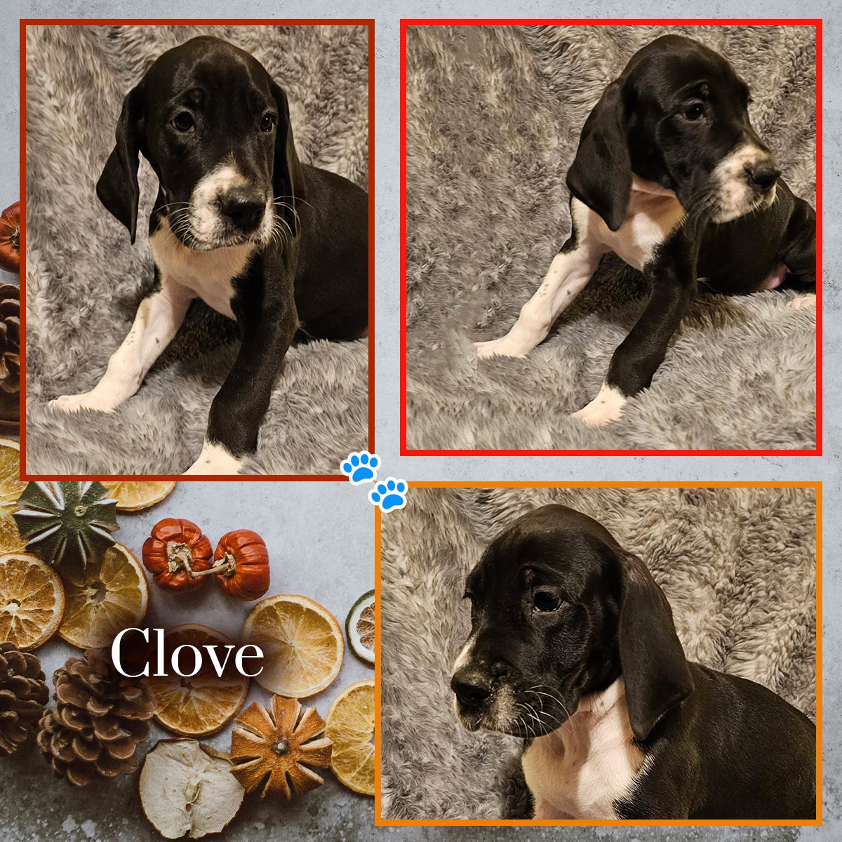 Introducing the Fall Flavors litter! Born 10/01/25. Sweet Evie is officially a mama — and she delighted us with 10 beautiful puppies! Everyone is healthy, wiggly, and already melting hearts here at Happy Danes Farm.